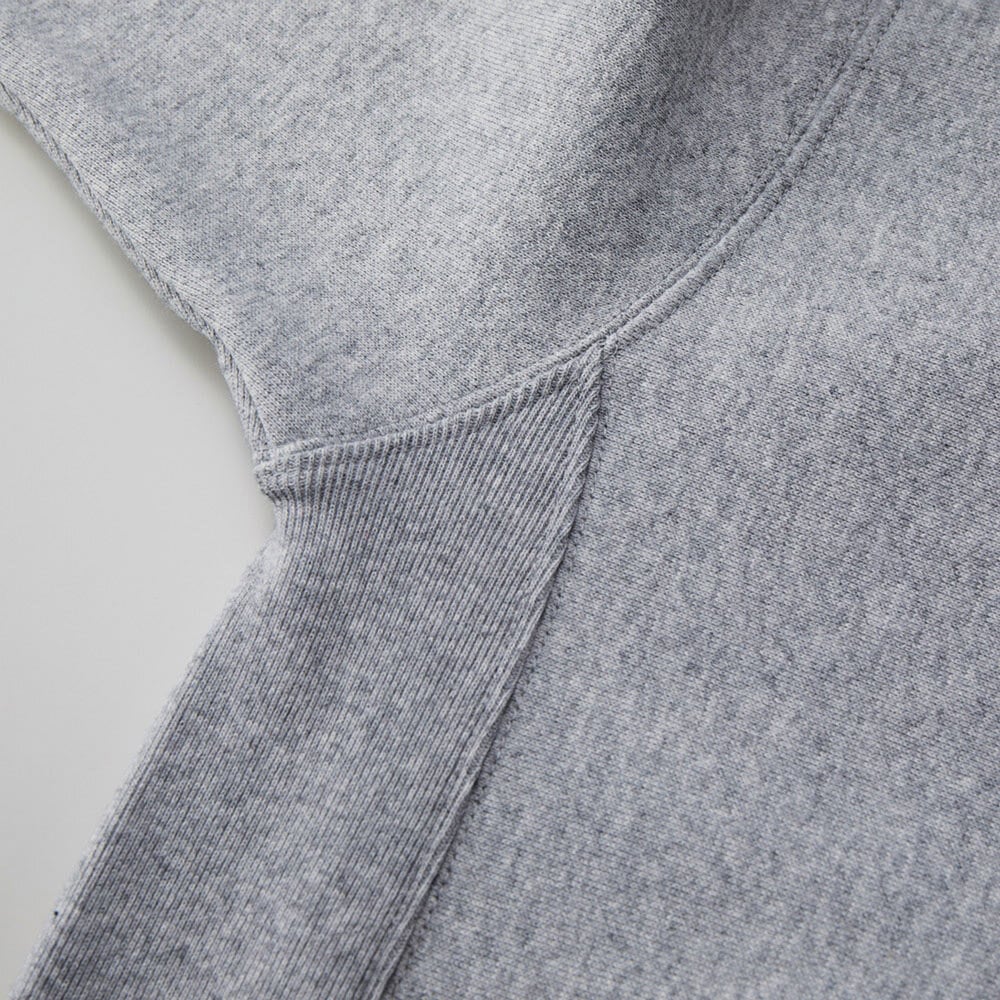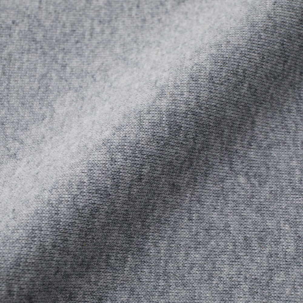 表面はオープンエンド糸特有のザラ感のあるざっくりした風合い、乾いた硬い肌ざわりの厚手生地が特徴。生地目を横取りしサイドパネルのリブ仕様となっているため、型崩れしにくく、洗うほどにタフになり、着こむほどに独特の風合いとエイジングが楽しめます。ゆったりとしたヴィンテージライクなシルエットで着用時の袖の絶妙なルーズさもポイント。大きめサイズでざっくりした着こなしが楽しめます。